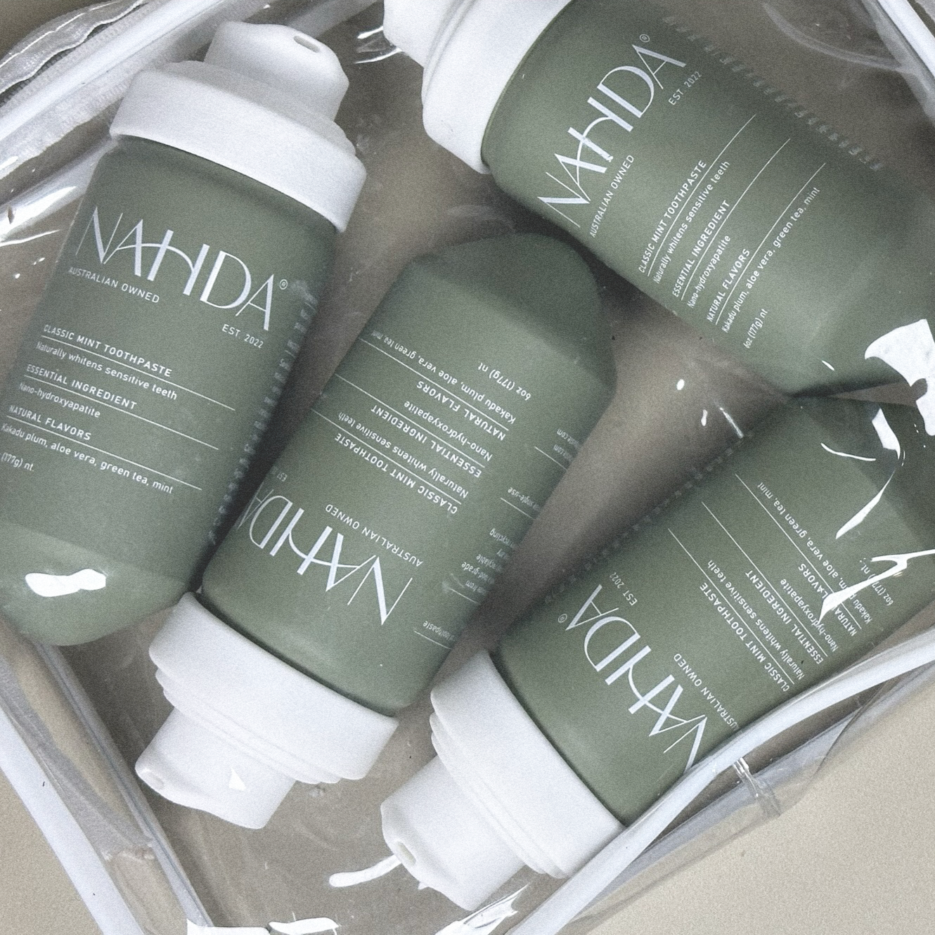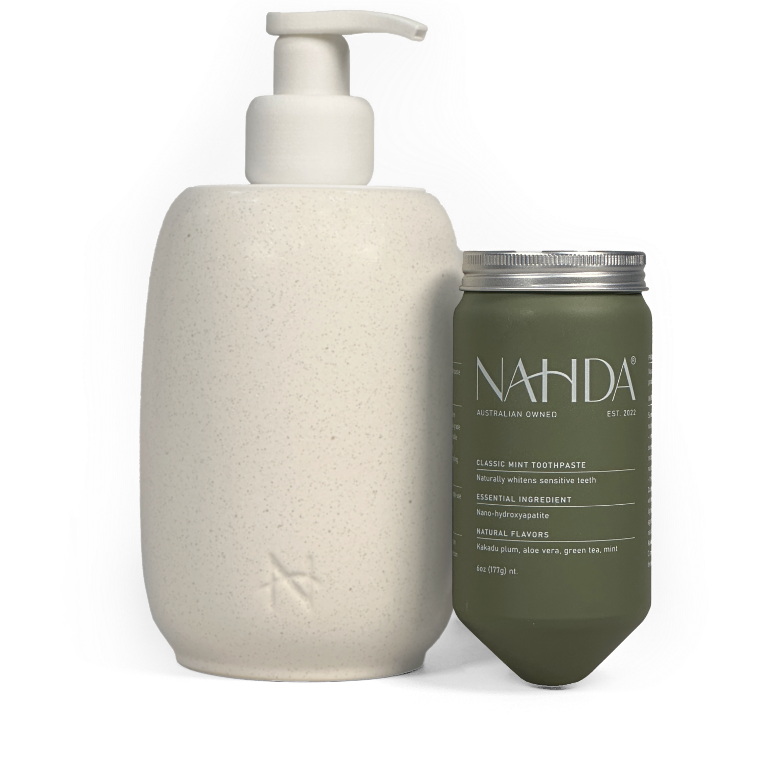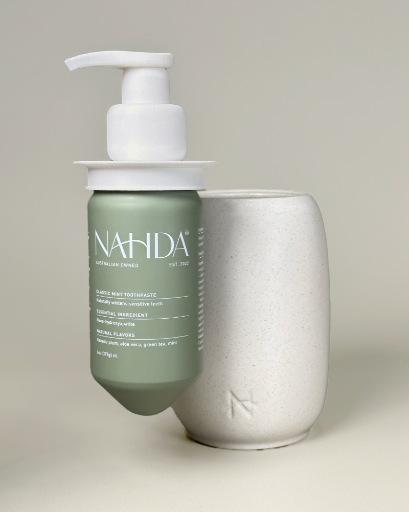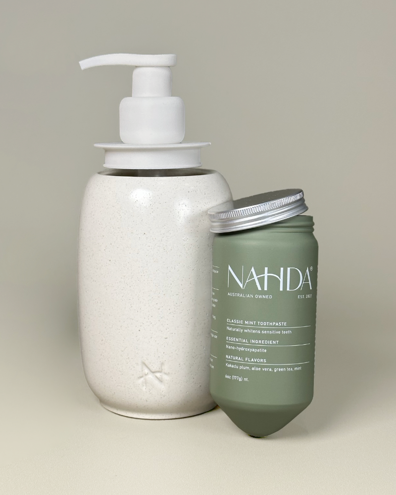 Nahda is reinventing oral care. Not only did we ditch nasty tubes for sustainable pods, we traded fluoride for nano-hydroxyapatite (n-Ha), a natural ingredient scientifically proven to remineralize tooth enamel. We complement this powerful ingredient with soothing aloe vera, vitamin rich kakadu plum, antioxidant-rich green tea and other clean ingredients. Now you don’t have to choose between a natural, safe toothpaste and a science-backed one. That’s something to smile about.